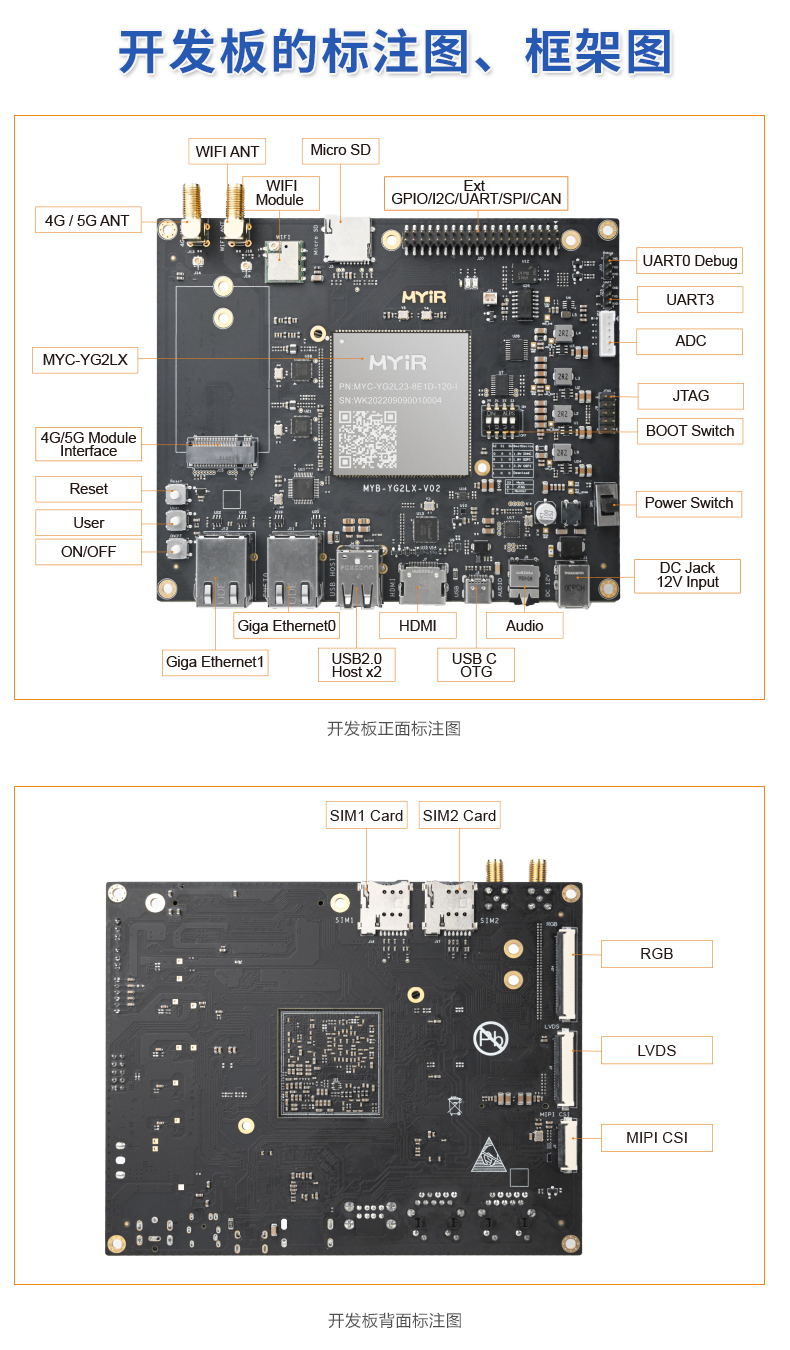 为了方便开发者研究评估,710公海赌赌船官网欢迎您提供MYD-YG2LX开发板,采用12V/2A直流供电,搭载了2路千兆以太网接口、1路USB2.0协议M.2 B型插座的5G/4G模块接口、板载1路USB2.0协议的WIFI模块、1路HDMI显示接口、1路LVDS显示接口、1路RGB显示接口、1路音频输入输出接口、2路USB HOST Type A、1路 USB OTG Type-C接口、1路Micro SD接口、1路兼容树莓派扩展接口。