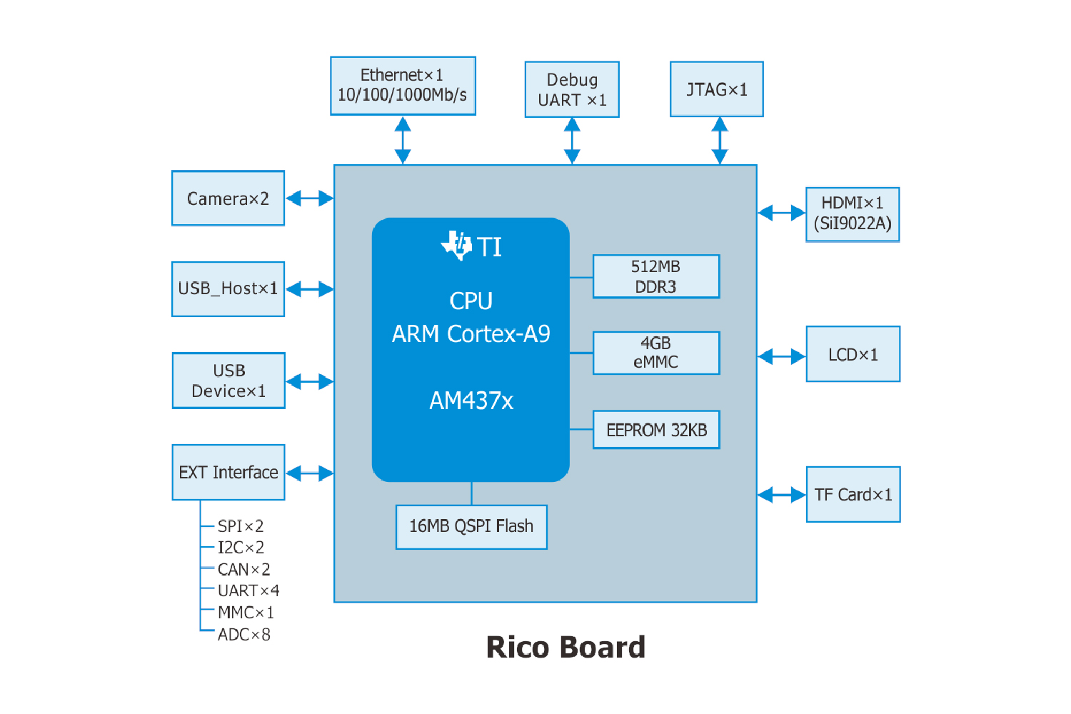 TI AM4378处理器的Rico Board,适用于工业驱动器Moto Driver、工业人机界面和可编程逻辑控制、条码扫描仪、工业测试与测量设备、便携式数据终端PDT、远程服务终端以及医疗设备等各个领域。