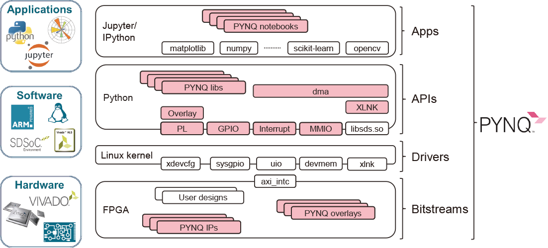 基于Xilinx Z-7000系列单板控制器,直接调用PYTHON库和FPGA硬件库进行功能的开发,通过ZYNQ(SOC)轻松的设计嵌入式系统,无需设计可编程逻辑电路的情况下即可通过PYNQ进行APSOC编程,并且代码可直接在ZYNQ 7000上进行开发和测试。通过PYNQ,可编程逻辑电路将作为硬件库导入并通过其API进行编程,其方式与导入和编程软件库基本相同。
