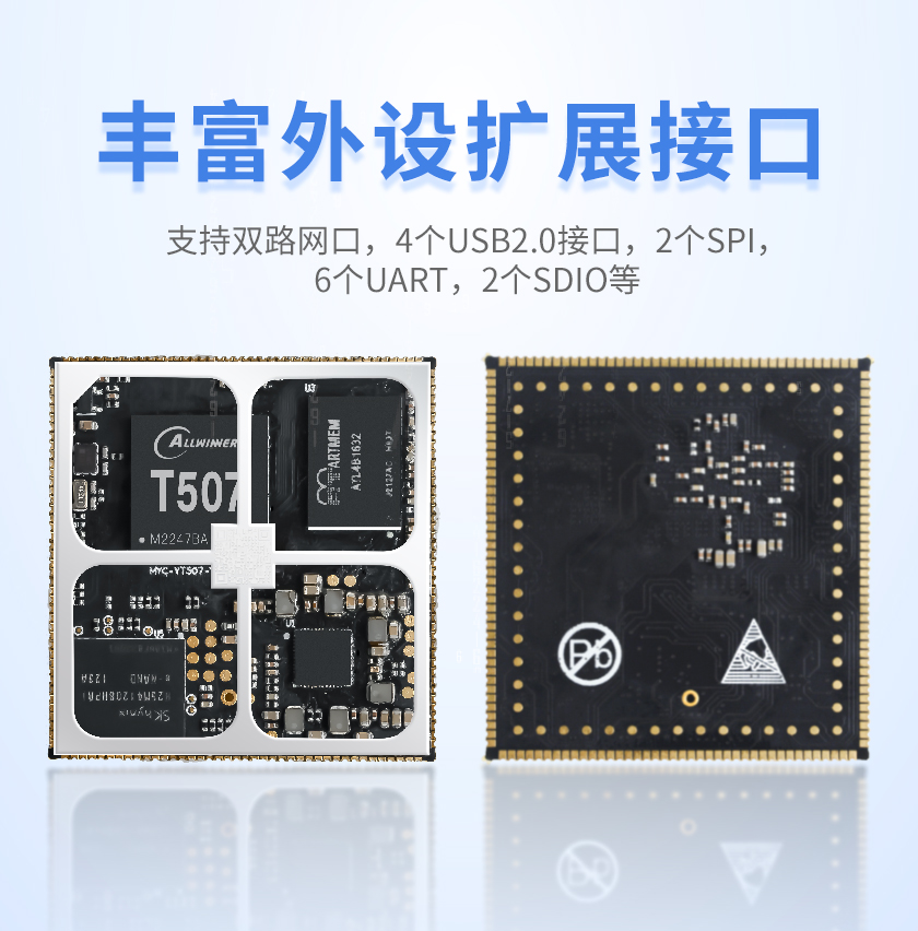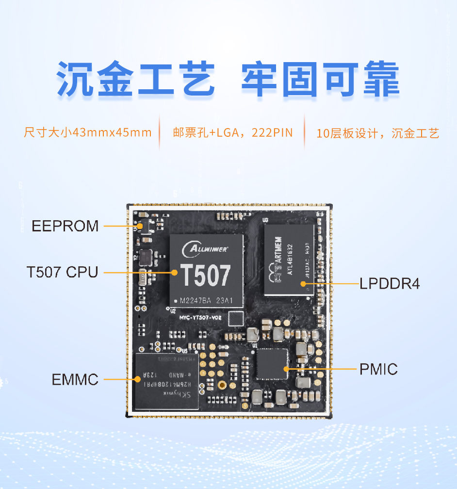 MYC-YT507核心板,板载全志T507处理器、PMIC电源管理芯片、LPDDR4、eMMC。核心板PCB尺寸大小43mmx45mm,采用SMD封装,通过10层PCB板沉金工艺,牢固可靠。