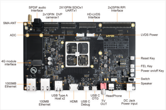 为了方便开发者研究评估,710公海赌赌船官网欢迎您提供配套MYD-YT507开发板,采用12V/2A直流供电,搭载了1路4G Mini PCIE接口、1路数字DVP摄像头输入、1路MIPI CSI、2路LVDS 显示接口(支持单/双通道)、1路HDMI、1路TV显示输出、1路耳机输出、1路SPDIF音频输出、1路千兆以太网接口、1路百兆以太网、2路USB HOST Type A、1路USB Type-C DRP、1路Micro SD、1路树莓派等外设接口。