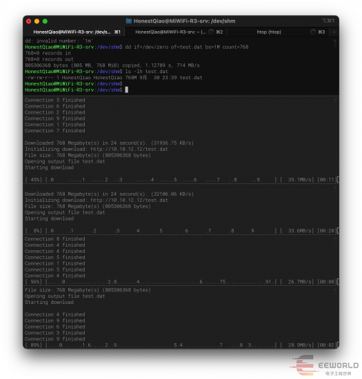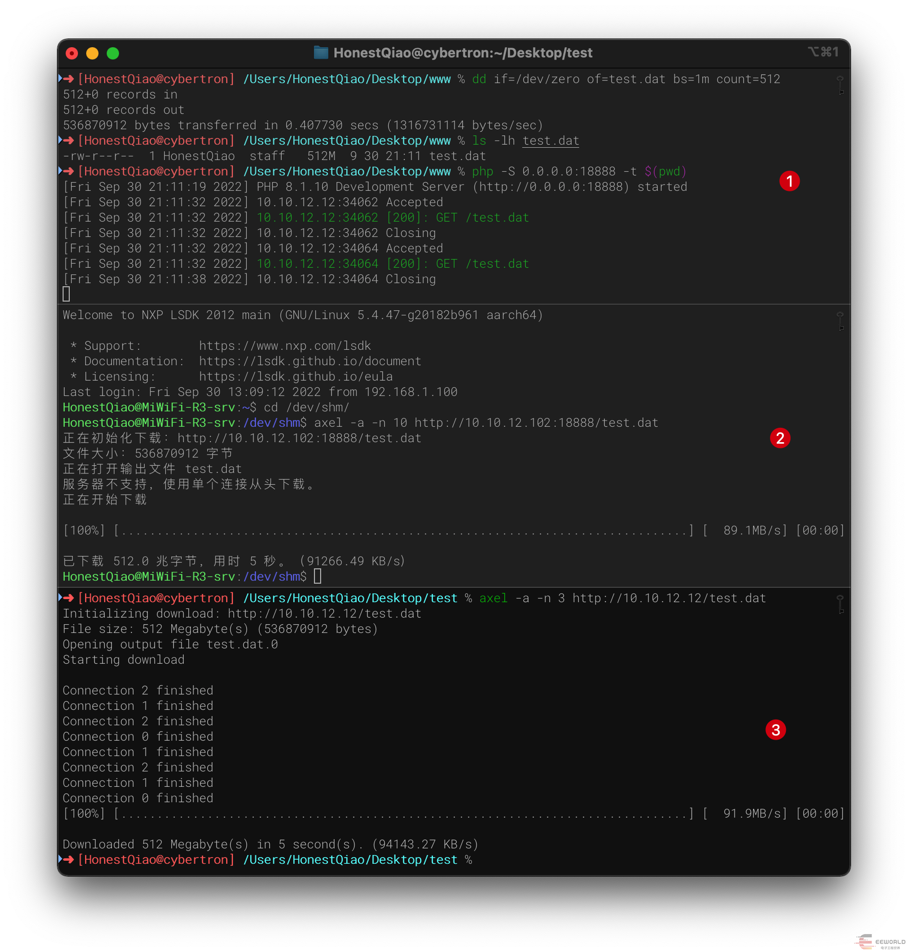在macOS上,使用dd指令,生一个512M的数据文件test.dat,并使用php提供随手web服务 在开发板上,使用axel,下载macOS上面的数据文件,保存到/dev/shm内存文件系统 在macOS上,使用axl下载开发板上的test.dat文件