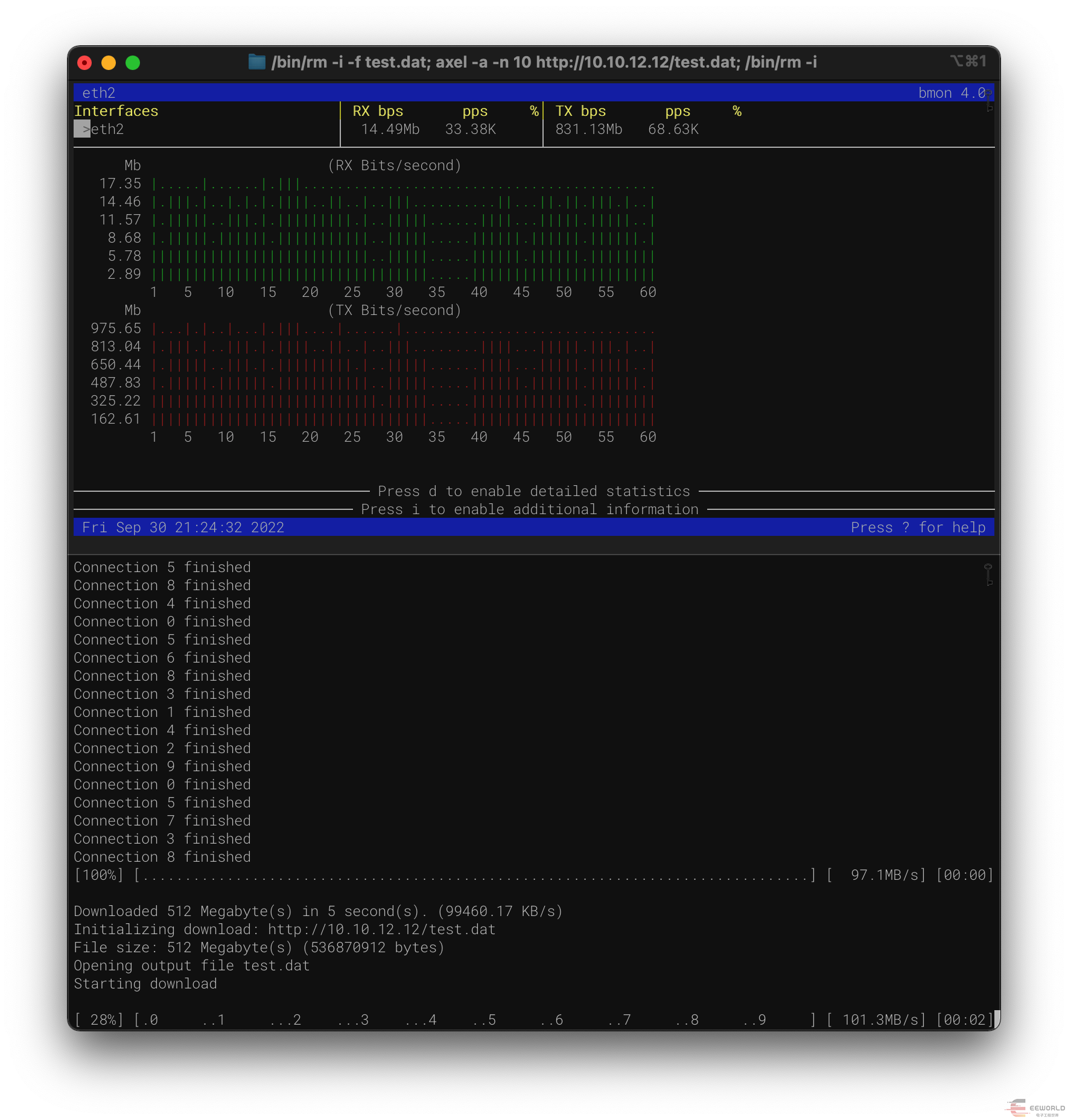 上面是使用nc进行数据传输,下面我们再使用axel通过nginx下载数据,看看带宽使用情况如何。