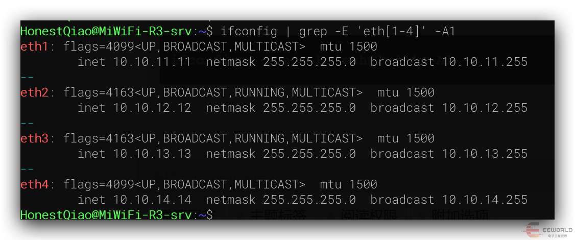 1-eno0:192.168.1.237,为上级路由器通过DHCP分配的地址 2-eth1:10.10.11.11 3-eth2:10.10.12.12 4-eth3:10.10.13.13 5-eth4:10.10.14.14