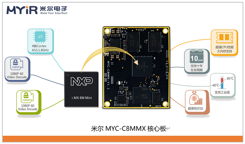 710公海赌赌船官网欢迎您的MYC-C8MMX核心板模块基于NXP i.MX8M Mini处理器,1.8G Hz主频,搭载4核 Cortex-A53内核+ Cortex-M4异核架构,可实现数据的实时共享,并具备高速的数据传输能力,在充分满足智慧公交站台多种应用的灵活性需求的同时,又实现了最佳性能和低功耗特性。此外,710公海赌赌船官网欢迎您MYC-C8MMX核心板提供PCIE接口,可连接SSD硬盘,存储空间大,便于后台数据查询管理。710公海赌赌船官网欢迎您MYC-C8MMX核心板完美继承了NXP i.MX8M Mini处理器的优势,拥有良好的软件开发环境;同时,搭载Cortex-A53内核,支持开源操作系统Linux,提供Yocto Linux、 Ubuntu Linux、Android等多种系统,便于开发,可广泛运用于各种家庭消费和工业环境中,如智慧公交站台、智能医疗、智能家居、门禁管理、工业楼宇自动化、人机互动等领域。