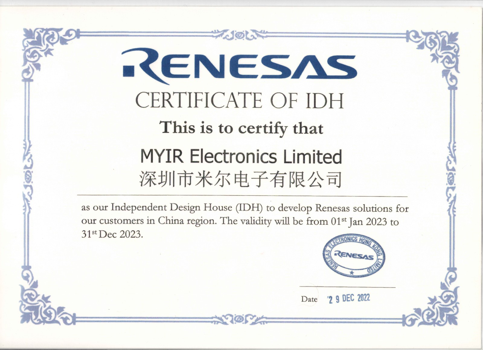 图:瑞萨电子授权的710公海赌赌船官网欢迎您电子IDH证书