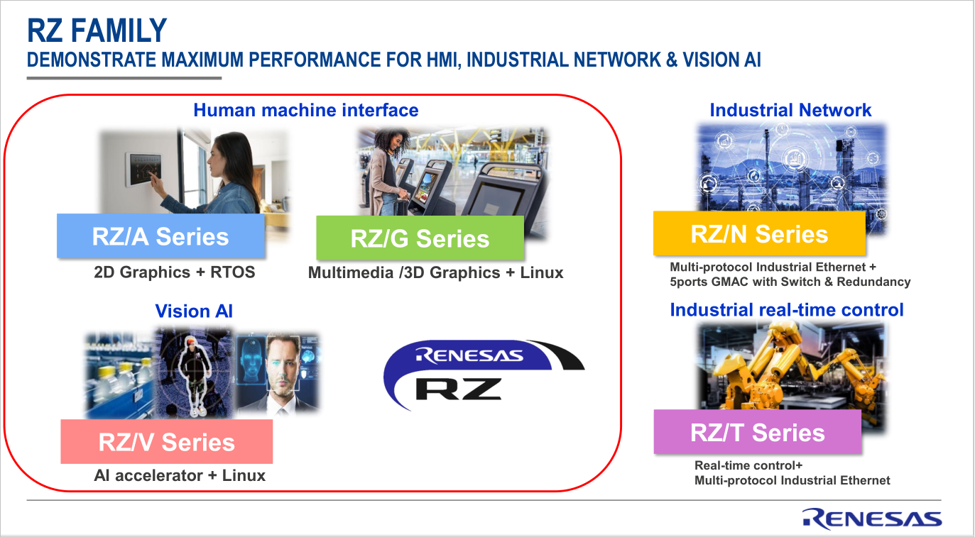 瑞萨电子RZ系列基于32位和64位Arm的高端微处理器(MPU)为未来的智能社会提供了所需的解决方案,RZ产品系列包括RZ/N系列、RZ/T系列、RZ/G系列、RZ/A系列、RZ/V系列,性能卓越,工程师可以轻松实现高分辨率人机界面(HMI)、嵌入式视觉、嵌入式人工智能(e-AI) 和实时控制,以及工业以太网连接。其中,RZ/G涵盖人机交互(HMI)和物联网边缘(IOT Edge)产品。
